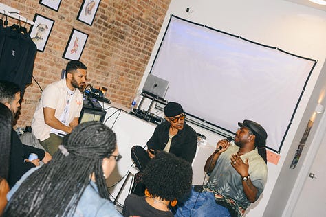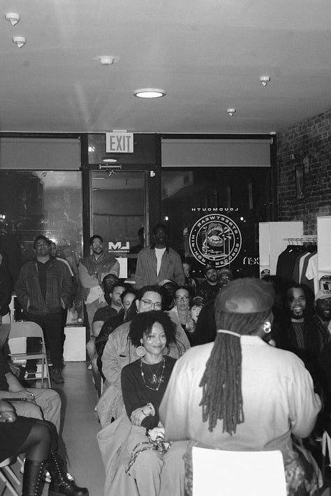 We started with a set from DJ Mamoudou - a professor by day and a vibe-setter by night. Folks gathered, communed over boxed wine, and explored the gallery of local artists on display within the walls of LoudMouth. We then settled the room into a Soft & Tender conversation with Kahiem Rivera and Harvey Leon - two friends who became brothers that evening. As we unpacked layered conversation about abandonment (some by choice, some by loss), forgiveness, healing, and empathy, sounds of sniffles, laughter, and grunts of agreement could be heard from the audience. My favorite part of doing live conversations is seeing what resonates with folks in real-time. These men were telling the audience's story simply by unpacking their own. One friend mentioned how this conversation felt the most therapeutic out of any S&T conversation to-date, and I couldn’t agree more.